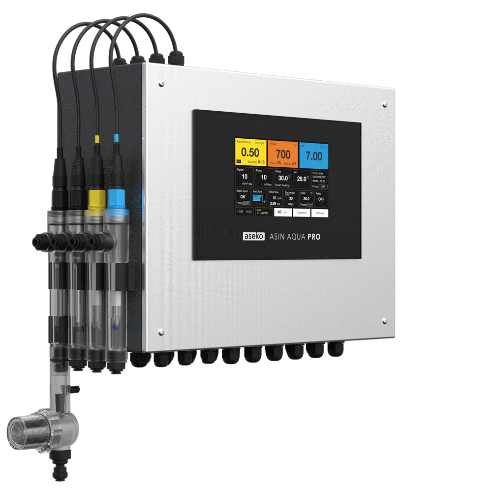 ASIN AQUA Pro Unmatched professional equipment for precise pool chemistry control and automated pool technology management. The device can be monitored and controlled remotely via ASEKO applications.